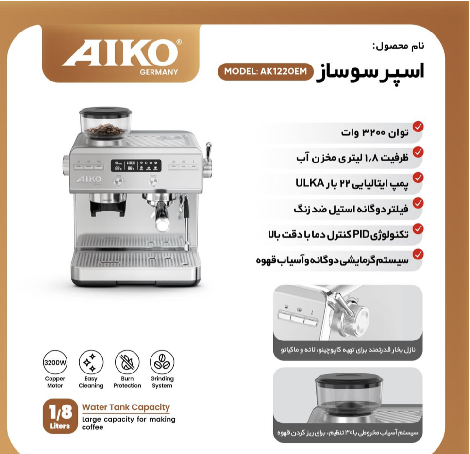 توان 3200 وات ظرقیت 1/8 لیتری مخزن آب پمپ ایتالیایی 22 بار ULKA فیلتر دوگانه استیل ضد زنگ تکولوژی PID کنترل دما با دقت بالا سیستم گرمایشی دوگانه و آسیاب