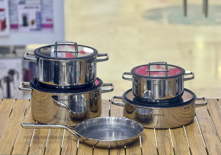 سرویس ۹تکه شامل قابلمه ۲۸ سانت ۱۰ نفره قابلمه ۲۴ سانت ۶ نفره قابلمه ۲۰ سانت ۴ نفره تابه دو دسته ۲۶ سانت تابه تک دسته ۲۶ سانت //