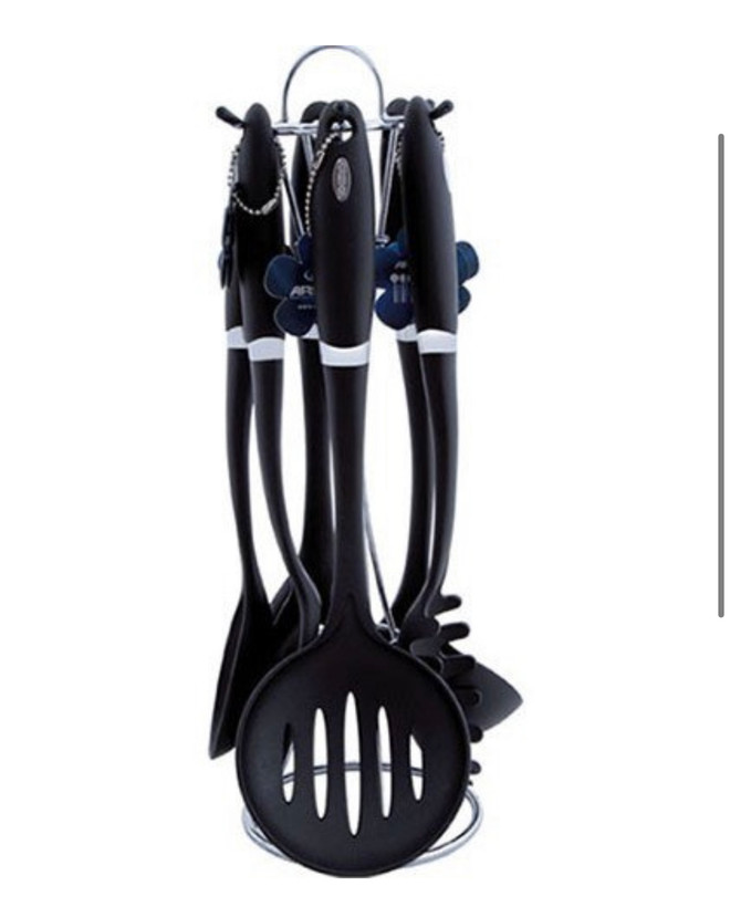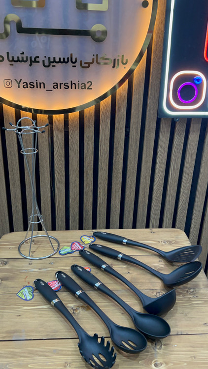 دو کفگیر، یک قاشق بزرگ، یک ملاقه، یک قاشق شکافدار ، یک چنگال اسپاگتی و یک استند