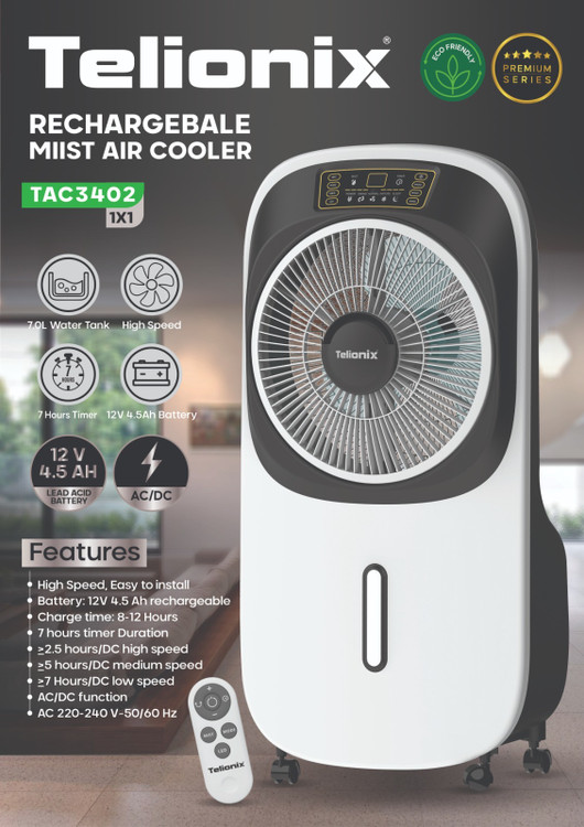 پنکه و کولر ایستاده تلیونیکس مدل TAC3402 محصولی کارآمد و قابل حمل است که با مخزن آب 2.5 لیتری خود، قابلیت مه پاشی را نیز ارائه میدهد. این دستگاه با باطری خشک شارژی کار میکند و برای راحتی بیشتر، دارای کنترل از راه دور است. طراحی چرخدار و قابل حمل آن، جابجایی این پنکه را بسیار آسان کرده است. از نظر شارژدهی، در دور تند تا 2 ساعت و در دور کند تا 3.5 ساعت شارژ نگه میدارد. همچنین، این پنکه قابلیت کار با برق 220 ولت و باطری 12 ولت را دارد. از دیگر ویژگیهای آن میتوان به چراغ LED، تایمر ۹ ساعته و قابلیت تنظیم دور موتور در 24 حالت اشاره کرد